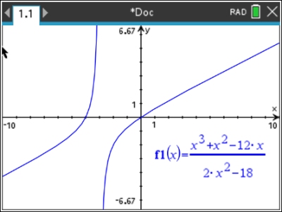 Note: The asymptotes were drawn on the graph AFTER the function was graphed. They were not part of the original graph prepared by the calculator. |