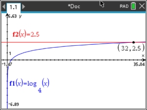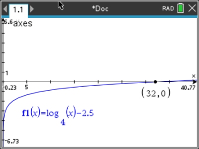 zeros (MENU, 6, 1), of the function. Function: log4x - 2.5 = 0