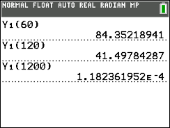 | NOTE: The temperature of the coffee stops cooling when it reaches the room temperature of 76°. The existence of the room temperature will actually affect the final exponential equation. Instead of the graph being asymptotic to the x-axis, the graph is actually asymptotic to the room temperature. If you visualize the room temperature as y = 76º, you will notice that there will be changes in the graph and consequently changes in the resulting equation. You can see how room temperature affects the graph and the equation for this problem at Newton's Law of Cooling. |
